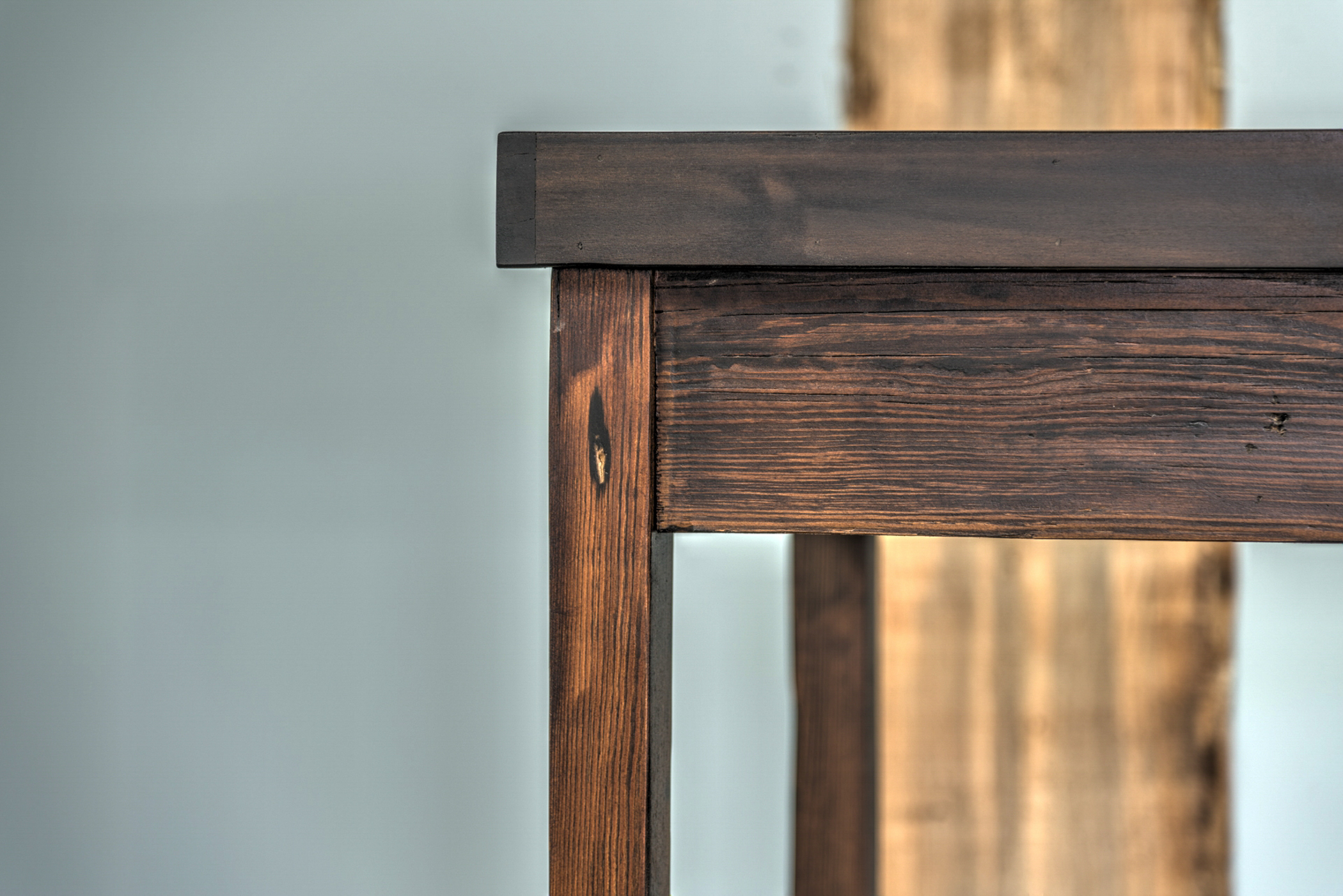 Sturdy and sleek table made from reclaimed wood and delicate reclaimed wood decorative legs.