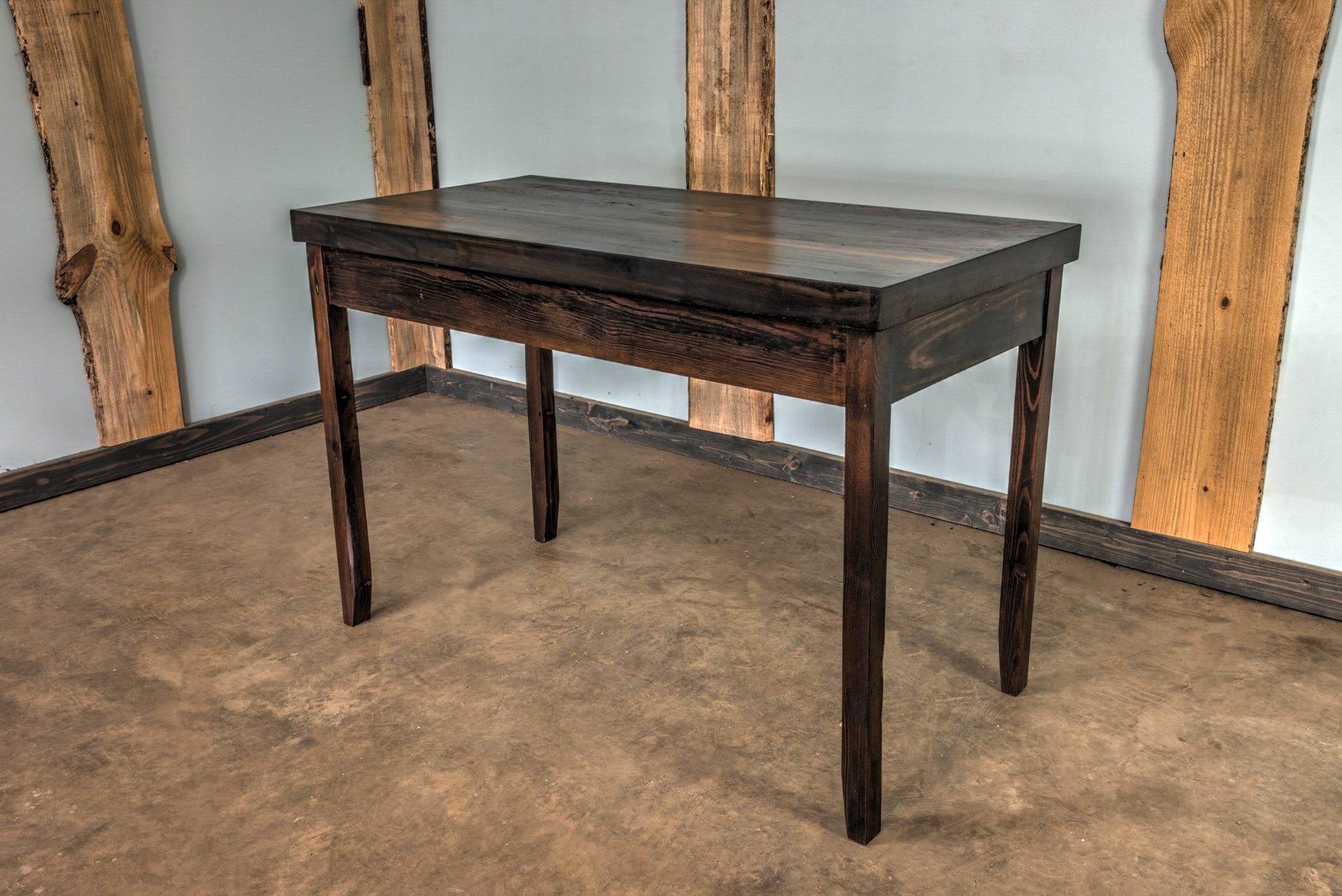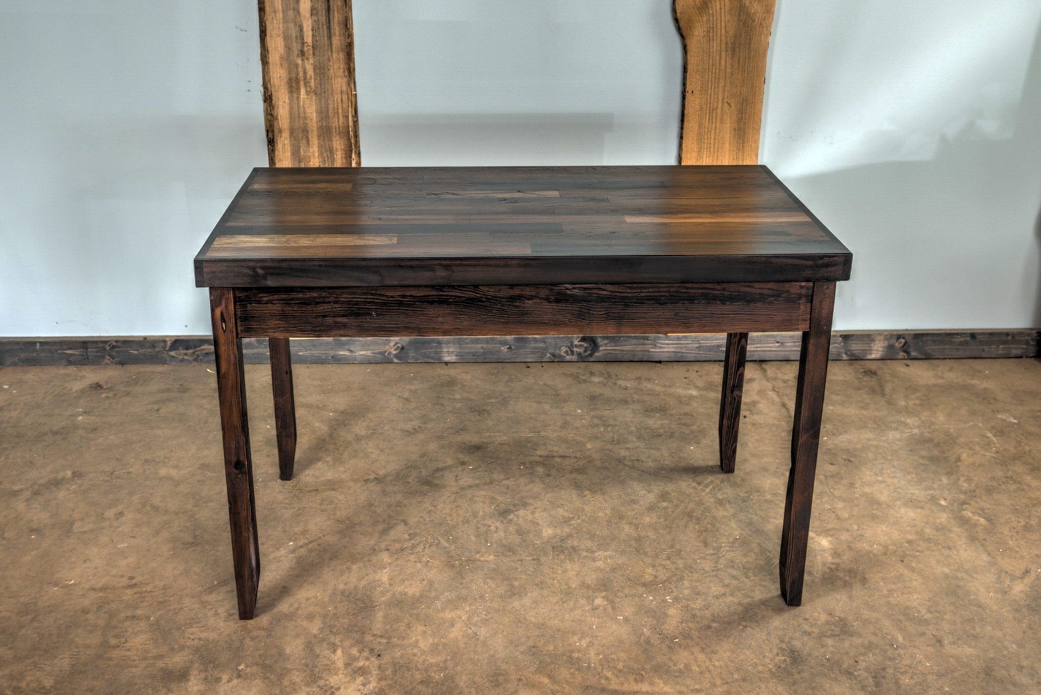 Sturdy and sleek table made from reclaimed wood and delicate reclaimed wood decorative legs.